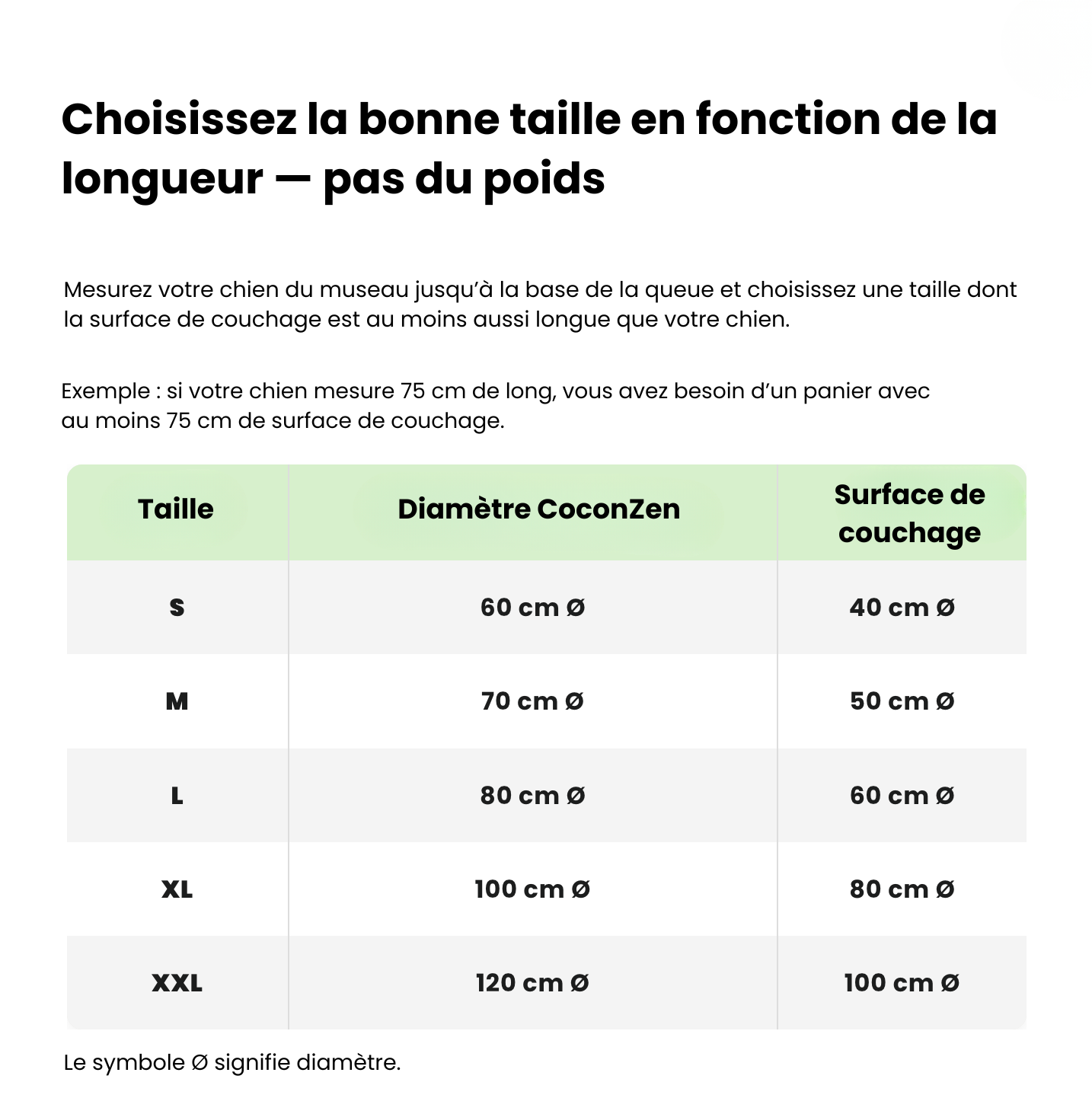 Par exemple, si votre chien mesure 75 cm de long, nous vous recommandons de choisir notre CoconZen XL, qui mesure 100 cm de diamètre.
